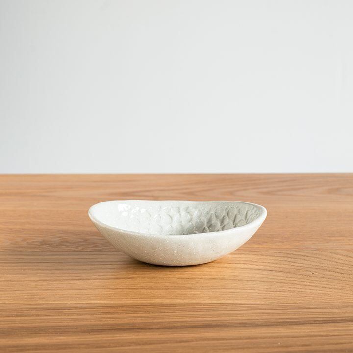 細かい白い粒の付いた釉薬。シンプルなカラーはどんな料理にもしっくり合います。ガラス質の釉薬は、洗いやすく機能性にも優れているので、毎日使うのに便利なお皿です。
