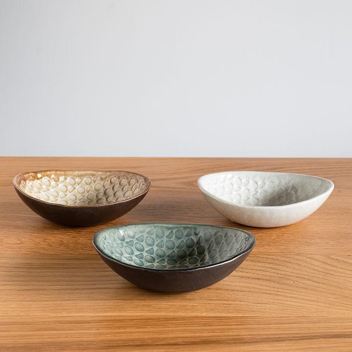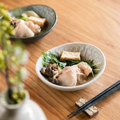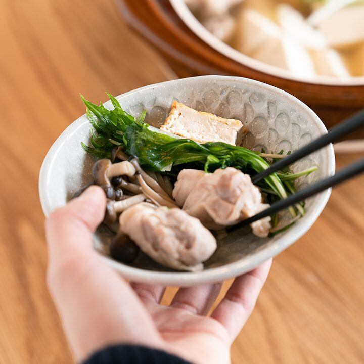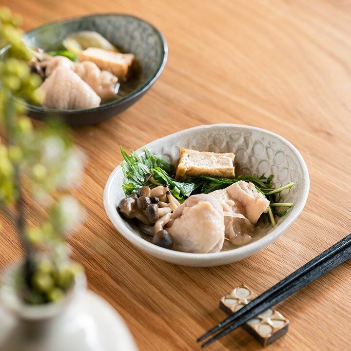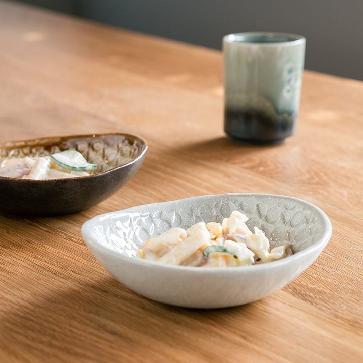 小さい深皿は、煮物やお鍋の取皿、サラダなどのお皿にぴったりです。 深さがしっかりあるので、汁気のある料理も盛り付けていただけます。 約14センチの緩やかな楕円形で、片手におさまるサイズ感になっています。
