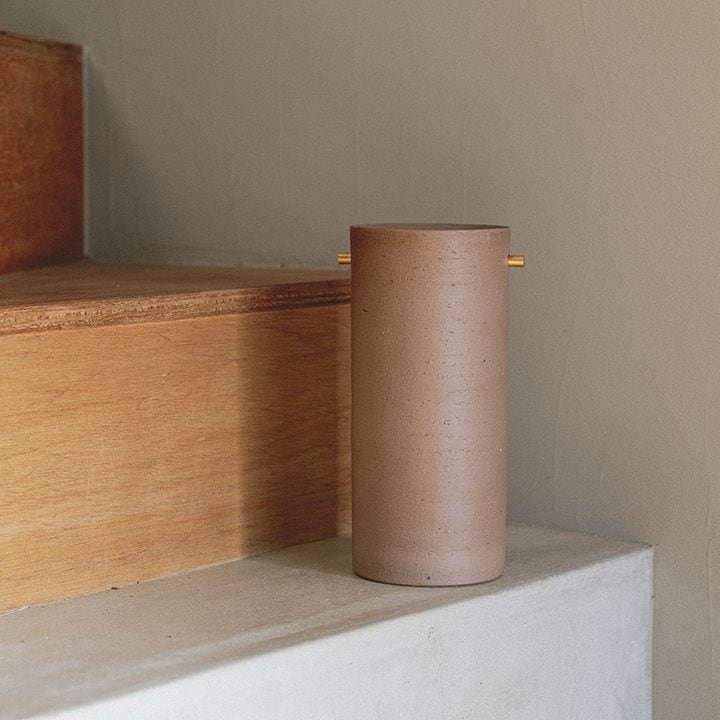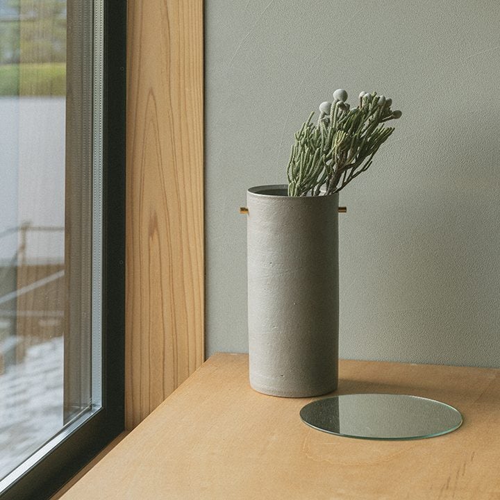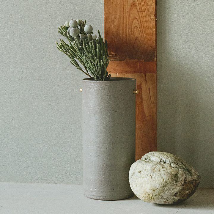 信楽の焼き物の伝統的なモチーフとして用いられる”手桶け”を、現代的な解釈でデザインした「TEOKE vase」は、真鍮の丸棒が印象的なラグジュアリーなフラワーベースです。