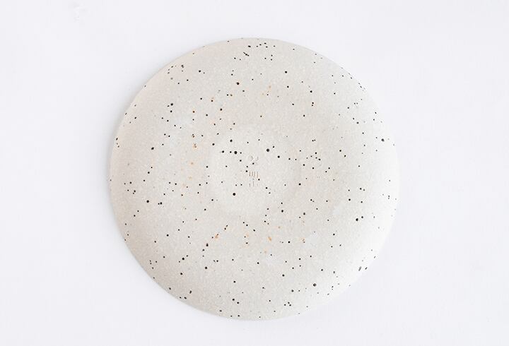白い素地にまだらに表出する鉄粉が特徴的な白御影。その佇まいは、どこか上品でモダンな印象が漂う。表面は全体を研摩処理しているため、マットでしっとりとした手触りで心地いいです。